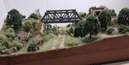 - Typischer ländlicher eingleisiger Streckenverlauf mit Brücke über Feldweg und Bachverlauf